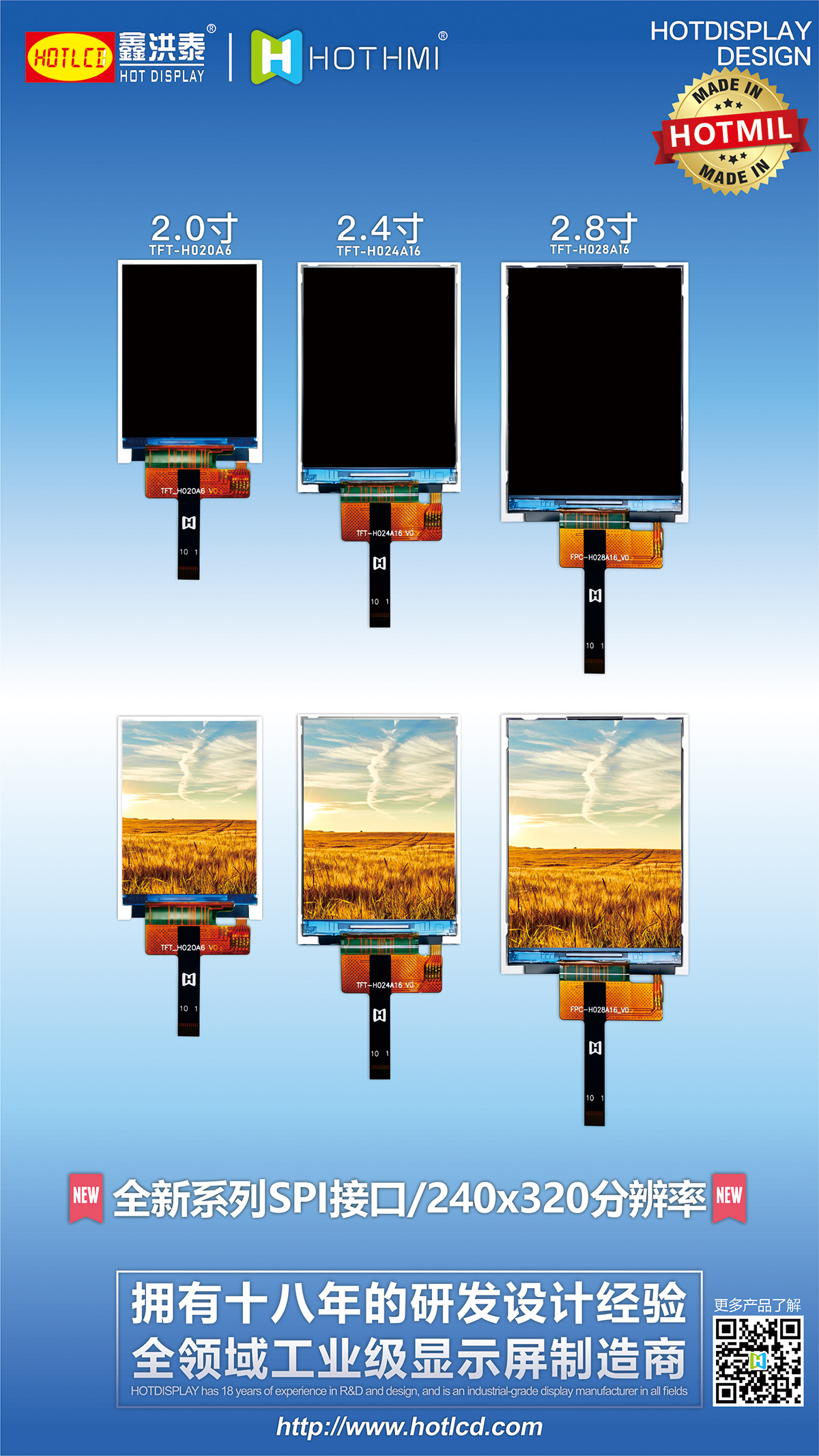 HOTLCD創(chuàng)立22年來,已開發(fā)出超過2000款標準和非標準液晶顯示屏及模組,廣泛應用于人工智能、5G通訊、無人機、物聯(lián)網(wǎng)、車聯(lián)網(wǎng)、智能家居、智能穿戴、智慧交通、儀器儀表、醫(yī)療設備、工控設備、電力設備、勘探設備、航空航天、軍事裝備等諸多先進領域。